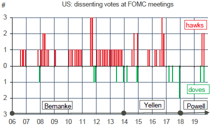 Depuis juin, le FOMC est divisé (graphe du bas). En septembre, une majorité de 7 membres sur 10 a opté pour une baisse de 25bp, mais deux préféraient le statu quo, un autre une baisse de 50bp. Depuis lors, les « faucons » n’ont pas changé d’avis, et le ton plus apaisé entre les US et la Chine ne renforce pas la position des « colombes ». Au milieu, Jerome Powell devra tenir une position d’équilibre délicate.
