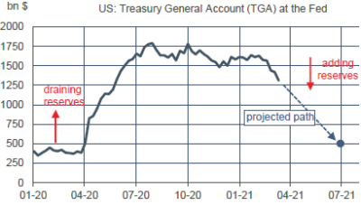 Au vu des déclarations émanant de la Fed, on ne voit pas le FOMC changer quoi que ce soit d’important à son analyse de l’économie et des marchés à l’issue de sa réunion du 17 mars. La reflation est en cours et la Fed n’a visiblement pas l’intention de réagir à la hausse des taux longs qui l’accompagne. Pour changer, on se penche ici sur les taux courts. Le marché monétaire où s’échange la liquidité au jour le jour est un rouage essentiel du système financier. Son bon fonctionnement dépend de la capacité de la Fed à piloter les taux courts sur le niveau du taux directeur, actuellement une marge de 0-0.25%. Si le marché des fonds fédéraux manque de liquidités, le taux court effectif peut s’envoler (épisode du « repocalypse » en 2019). Dans les prochaines semaines, à l’inverse, il y aura trop de liquidités. La raison tient au rôle que le Trésor joue sur le marché monétaire. Le Trésor a un compte unique à la Fed (TGA). L’an dernier, à titre de précaution, il avait été augmenté de 1200Md$. Cette précaution n’est plus nécessaire.