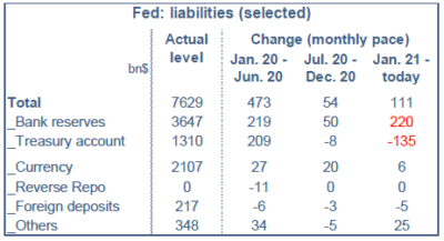 Le Trésor entend le réduire d’environ 8000Md$ d’ici la mi-année (graphe). Une baisse du TGA a pour effet de réduire les Treasury bills qui s’échangent et de gonfler mécaniquement les réserves excédentaires des banques (tableau). S’il y a trop de liquidités, le taux j.j. effectif (actuellement 0.07%) pourrait passer en territoire négatif, ce qui causerait toutes sortes de perturbations malvenues au secteur financier. De plus, à partir du 1er avril, le calcul du Supplementary Leverage Ratio (SLR) doit réintégrer les réserves excédentaires, mettant fin à une exemption mise en place dans l’urgence de la crise il y a un an. En retour, cela pourrait pousser les banques à ne pas augmenter leur bilan en freinant l’octroi de crédit. Pour éviter le gonflement des réserves excédentaires des banques, la Fed pourrait certes réduire ses achats d’actifs, mais en pratique, un tel tapering ne ferait qu’alimenter la volatilité. C’est donc exclu. Il y a heureusement d’autres moyens de s’assurer que la plomberie monétaire ne se bouche pas, tels que renouveler l’exemption sur le SLR ou relever le taux de rémunération des réserves excédentaires (IOER, actuellement 0.10%). La décision pourrait être prise dès mercredi.