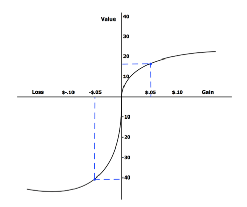 La théorie des perspectives décrit l’évaluation asymétrique des pertes par rapport aux gains. En d’autres termes, la frustration que vous ressentez en perdant est plus forte que la satisfaction que vous éprouvez en gagnant. Si les émotions pouvaient être exprimées en chiffres, la « frustration » que vous éprouvez en perdant 20 dollars vous donnerez l’impression d’avoir perdu bien plus que cela. Alors que la satisfaction ressentie en gagnant 20 dollars vous donnerez l’impression d’avoir gagné 20 dollars, voire moins. Le graphique ci-dessous présente la fonction de valeur de cette théorie. Comme on peut le voir, la fonction de valeur pour les pertes (à gauche) est plus raide que la fonction de valeur pour les gains (à droite), ce qui signifie que les pertes l’emportent sur les gains en termes de valeur perçue.