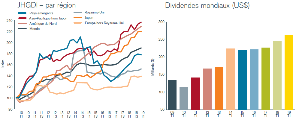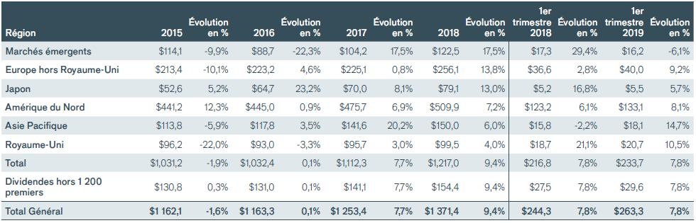 - Les dividendes ont, à l’échelle internationale, balayé les inquiétudes liées à la croissance économique mondiale, augmentant de 7,8% pour atteindre 263,3 milliards de dollars US, un record pour le premier trimestre