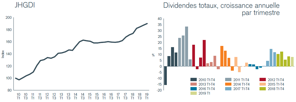 La croissance des dividendes en Asie Pacifique hors Japon fut la plus solide jamais enregistrée au monde depuis 2009, les bénéfices et les taux de distribution augmentant. Le total de 18,1 milliards de dollars US enregistré au cours du premier trimestre correspond à une hausse de 14,7% des dividendes totaux par rapport au 1er trimestre 2018, établissant ainsi un nouveau record pour le premier trimestre, bien que ce résultat soit principalement dû aux dividendes exceptionnels versés au cours de ce qui est, traditionnellement, un trimestre relativement calme pour les dividendes. La croissance sous-jacente fut plus modeste (3,8%), avec Hong Kong en tête de file, et l’Australie à la traîne.