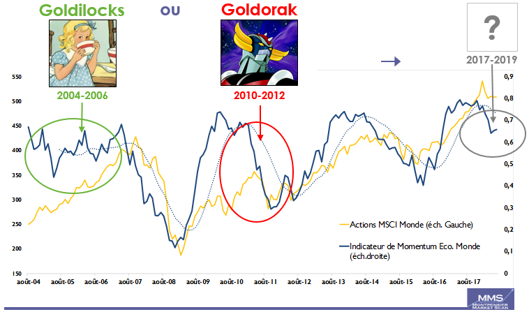 Selon une vision optimiste, la situation actuelle pourrait ressembler au cycle 2004-2006: un cycle que l’on pourrait qualifier de «Goldilocks» («Boucles d’Or» en français). Dans ce conte pour enfant, la petite fille «Boucles d’Or» choisit une soupe qui n’est ni trop chaude ni trop froide. Ainsi, face à une économie fonctionnant à bon régime, ni surchauffe ni ralentissement marqué, les marchés d’action pourraient se comporter comme en 2004-2006.