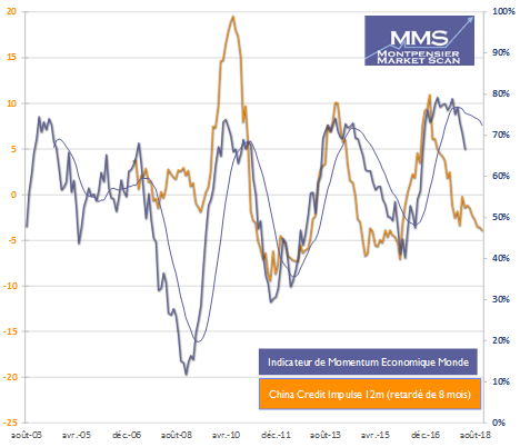 Le «China Credit Impulse» a ralenti car la Chine voudrait stabiliser sa croissance économique et son endettement devenu problématique. Elle souhaiterait aussi limiter les surinvestissements contre-productifs (le taux de rentabilité marginal des investissements ayant été au moins divisé par 2 depuis 10 ans).