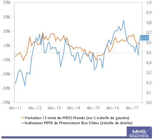 Notre indicateur MMS de momentum économique chinois (accélération ou décélération de la croissance) est très corrélé aux variations des marchés d’actions mondiaux. Nous écrivions fin novembre 2017 que l’accélération de la croissance chinoise depuis mai 2016 avait nourri le rebond des marchés des 18 derniers mois. Sa décélération était à surveiller.