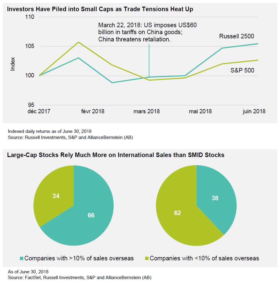 Comme le montrent les deux graphiques suivants, les petites sociétés américaines sont moins dépendantes des ventes à l’étranger. De ce fait, elles sont moins susceptibles de souffrir lors d’une guerre commerciale entre les Etats-Unis et le reste du monde.