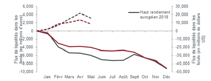 Source : flux européens – JP Morgan, Bloomberg, ETF compris ; flux américains – Barclays, Lipper, ETF compris, au 30 mai 2019.
