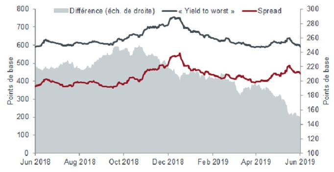 Source : Bloomberg, ICE BofAML Global High Yield Bond Index, du 18 juin 2018 au 18 juin 2019. 100 points de base = 1 %.