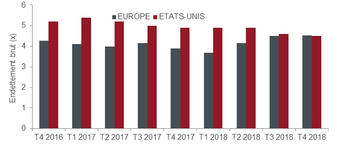 Source : endettement brut en Europe – recherche de Morgan Stanley, Bloomberg, étudiant un échantillon de l’indice European iBoxx HY, au 31 décembre 2018. Endettement brut aux États-Unis – Credit Suisse, indice Credit Suisse Liquid US High Yield au 31 décembre 2018. Endettement brut = dette totale/EBITDA (anglais pour « earnings before interest, tax, depreciation and amortization », résultat avant intérêts, impôts et amortissements).