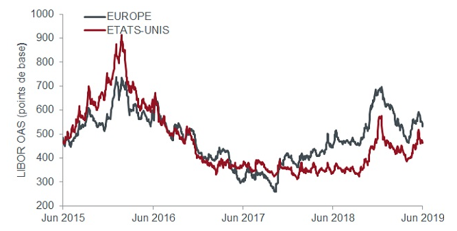 Source : Bloomberg, indice ICE BofAML European Currency High Yield B (HP20), indice ICE BofAML US High Yield B (H0A2), du 19 juin 2015 au 19 juin 2019. Spread Libor ajusté de l’option de fonds.
