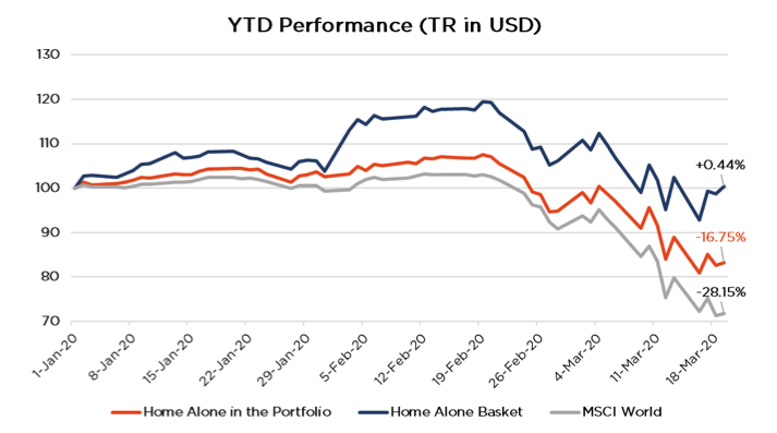 Depuis le début de l’année, notre panier « Home Alone » a surperformé le MSCI World de +9% depuis que le sommet du marché. Mais surtout, ces titres ont permis de préserver le capital: le panier est resté stable, à +0.44% depuis le début de l’année. En revanche, le MSCI World est en baisse de 28.15% sur la même période (graphe).