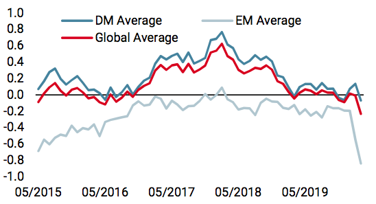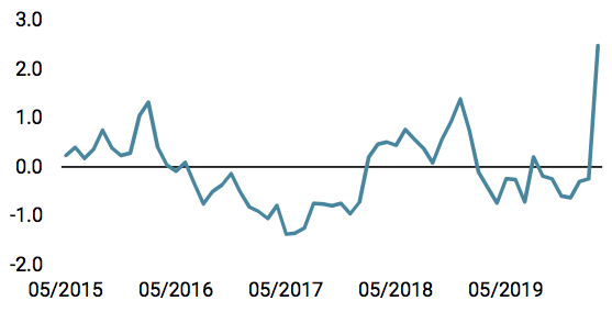 3. Une poursuite de la baisse des actions, en ligne avec l’ampleur de la contraction économique actuellement prévue. Historiquement, en période de récession, chaque pour cent de croissance négative du PIB signifie une contraction d’environ dix fois la croissance des bénéfices et une variation comparable du prix des actions. Les prochains rapports sur les bénéfices deviendront exceptionnellement pertinents pour la prise en compte des cours des actions. Par conséquent, une baisse depuis le pic du marché similaire à 2008 est nécessaire pour répondre à notre scénario macroéconomique central.