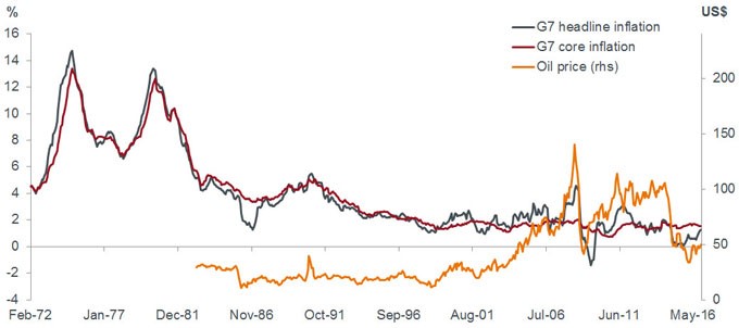 Certains gérants actions sont surexcités lorsque la hausse du cours du pétrole entraîne une progression de l’inflation globale, alors que certains gérants de la communauté obligataire sont particulièrement enthousiastes lorsque la chute du cours du pétrole entraîne une baisse considérable de l’inflation globale. Même l’indice de base des prix à la consommation présente quelques anomalies – la plus importante étant un coût implicite des loyers dans le secteur du logement ; à des niveaux élevés récemment, la tendance devrait repartir à la baisse. Le prix des voitures d’occasion suite à l’ouragan et la déflation agressive du prix des téléphones portables peuvent conduire à une fluctuation de ces taux. Une fois encore, nous ne nous attendons pas à une envolée structurelle de l’inflation sous-jacente ! L’inflation sous-jacente dans les pays du G7 est restée proche de 2% depuis de nombreuses années (voir graphique ci-dessous).