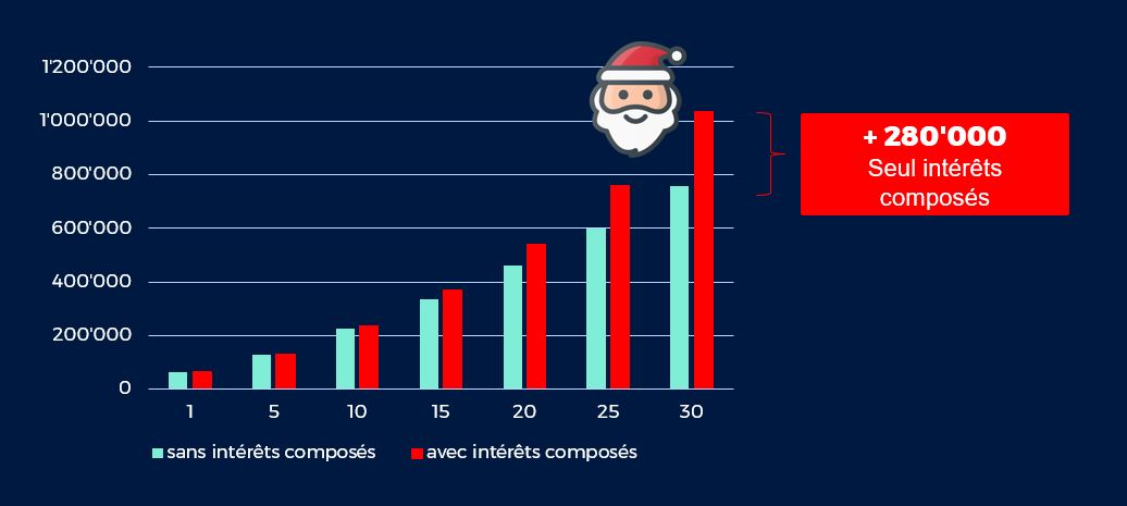 Pour pouvoir acheter ces tonnes de jouets, le Père Noël aurait dû investir, il y a 60 ans, près de 14 millions de francs dans un portefeuille générant un rendement annuel de 5%. De cette manière, grâce à l’effet de l’intérêt composé, il disposerait aujourd’hui d’une fortune de plus de 240 millions pour acheter à tous les enfants sages les cadeaux qu’ils souhaitent.