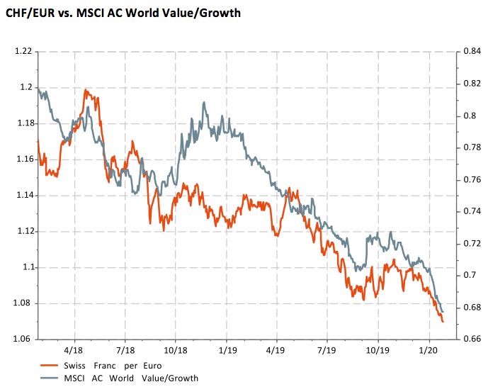 La deuxième raison, je pense, est liée à d’autres tendances ou phénomènes actuels que l’on observe sur les marchés financiers, tels que la progression concomitante du prix de l’or ou la surperformance des actions «growth» (croissance) par rapport à celles de type «value»… En d’autres termes, la hausse des marchés actions depuis le début de l’année n’a pas été équitablement répartie entre les secteurs et les styles: c’est, de manière contre-intuitive, les secteurs à caractère plus défensifs, les grandes capitalisations et le style «growth» qui ont tiré le marché vers le haut, alors que le reste a fait en gros du surplace, voir a baissé (-0.7% au 23 janvier pour le MSCI Europe Value par exemple). Le franc suisse a donc suivi exactement la même trajectoire que les actifs alliant qualité et croissance. A l’instar de ces derniers, il est perçu comme «cher», mais comme dirait mes collègues analystes et gérants actions, la qualité et la croissance méritent une surcote!