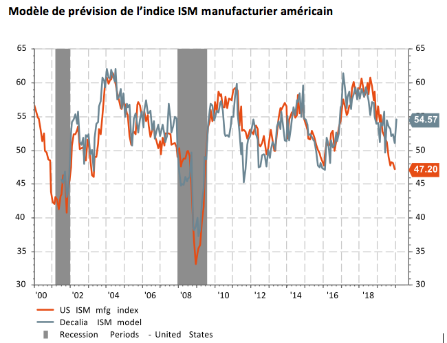 Dès lors que nous avons établi quelles sont les facteurs sous-jacents qui influencent le cours du franc suisse, au-delà des vaines et temporaires interventions de la BNS, il est plus aisé d’anticiper quelles pourraient être les éléments qui déclencheraient un certain affaiblissement de notre «chère» devise nationale. Selon notre modèle de prévision de l’indice ISM manufacturier américain, nous pourrions assister à un rebond assez marqué de ce dernier, bien au-dessus de 50 (voir ci-dessous), lors de sa prochaine publication (lundi 3 février). Si c’est le cas, et plus encore si certaines pressions à la hausse sur les salaires (les données de l’emploi aux Etats-Unis seront publiées quelques jours plus tard) venaient à apparaître, cela devrait conduire à un rebond des taux d’intérêt, une rotation de la «growth» vers la «value», et in fine à un franc suisse un peu plus faible… au moins temporairement tant que les déséquilibres structurels ne seront pas corrigés.
