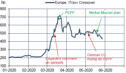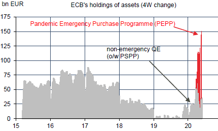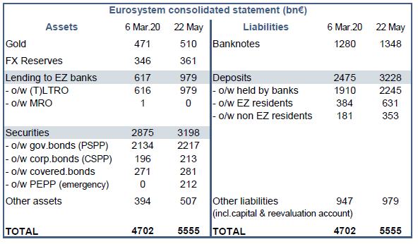 Depuis fin mars, le montant des achats de la BCE s’est élevé à 212Md€ au titre du PEPP, et à 301Md€ si on ajoute les autres programmes. Même si les situations ne sont pas identiques, notons que les achats de titres par la Fed ont été environ cinq fois plus importants sur la même période. Une augmentation de l’enveloppe du PEPP a été discutée lors de la réunion du 30 avril, et il y a tout lieu de penser qu’elle sera décidée à la réunion du 4 juin.