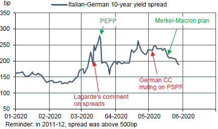 De l’avis général des officiels de la BCE, le PEPP est l’instrument le plus efficace pour répondre aux tensions de marché car il offre plus de flexibilité que tous les autres. Il a permis de comprimer les spreads de crédit (graphes). Ce serait inconséquent de laisser planer l’idée que les interventions de la BCE sont limitées par un plafond arbitraire. Dans une situation d’urgence, il n’y a pas par définition plus aucune limite.