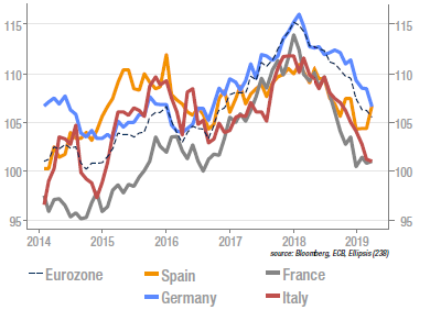 Les indicateurs de confiance publiés par la Commission européenne se sont inscrits globalement en baisse en mars, le composite de la zone euro perdant 0,7 points, à 105,5. Ce sont l’activité manufacturière et les services qui ont pesé dans la balance, les composantes construction, ménages et distribution se portant plutôt mieux. Du point de vue géographique, la France et l’Italie, qui avaient fortement baissé l’année dernière sont plutôt stables, l’Allemagne baisse fortement tandis que l’Espagne enregistre un rebond significatif. On observe une décorrélation entre les cycles manufacturier (en contraction) et de construction (au plus haut), alors qu’ils sont habituellement assez synchrones.