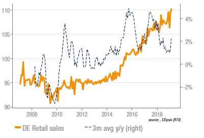 Après l’effondrement observé en décembre, les ventes de détail ont fortement rebondi en Allemagne. Elles ont progressé de 0,9% en février, contre -1,0% attendu. Le glissement annuel est, lui, à 4,7%, contre 2,1% attendu. La confiance reste en outre élevée chez le consommateur et les immatriculations ont retrouvé un rythme normal après les déboires de la fin d’année dernière. On devrait donc logiquement assister à une très forte contribution de la consommation au premier trimestre. Si le point faible de l’économie Allemande reste aujourd’hui les exports (dont la part dans le PIB est très élevée), cette publication montre que la demande intérieure devrait résister et amortir le choc.