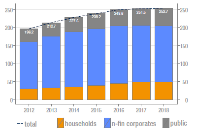 La croissance du crédit en 2018 (le dernier chiffre que nous disposons de la BRI était à fin septembre) n’a été que d’environ 1 point de PIB, en net recul par rapport aux années précédentes, qui avaient vu la Chine rejoindre rapidement le niveau d’endettement des pays développés – Japon mis à part. C’est là une conséquence des politiques de réduction de la finance parallèle et de freinage du marché immobilier mises en place depuis plusieurs années. Ce sont les entreprises qui contribuent à la stabilisation par la réduction de leur levier, tandis que la dette publique progresse avec les politiques de soutien mises en oeuvre. Même si elle pèse sur la croissance, il faut se réjouir de cette évolution qui réduit un risque systémique important.