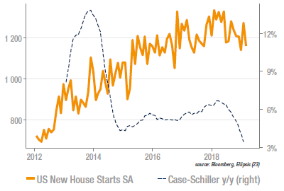 Le mois de février n’aura pas été celui du rebond pour les mises en chantier de logements aux US. La baisse séquentielle a été de 8,7%, à 1.62m (/a). Les permis de construire n’ont pas amélioré le tableau, avec une baisse de 1,6%, à 1,6m (/a). L’ajustement à la baisse des taux hypothécaires est probablement encore trop récent pour que ses effets soient déjà visibles. Sur le front des prix, on notera que la croissance annuelle, mesurée par l’indice Case-Schiller n’est plus que de 3,6% y/y, c’est-à-dire inférieure à la croissance nominale de l’économie et au plus bas depuis 2012. L’indice NAHB de confiance des entrepreneurs, une donnée un peu plus avancée du secteur de la construction, avait, lui, rebondi en début d’année.