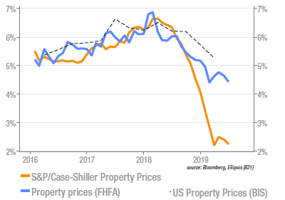 Les hausses annuelles des prix de l’immobilier aux US varient beaucoup selon les indices mais toutes décroissent manière uniforme. Ainsi, l’indice Case-Schiller était inchangé en juin, tandis que celui de la FHFA gagnait 0,1% (+4,7% y/y). Il semble donc que la baisse des taux ne se transmette pas aux prix de l’immobilier et à l’économie. Plusieurs effets doivent toutefois être pris en compte: