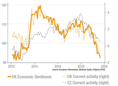 Selon les indicateurs estimant l’activité en temps réel, l’économie britannique serait aujourd’hui au mieux en stagnation. La baisse récente du sentiment des agents (mesuré par la Commission européenne) y est pour beaucoup. Elle résulte d’un pessimisme accru des consommateurs, mais, surtout, des entreprises et particulièrement du secteur des services. Il s’agit donc de facteurs domestiques, même si la morosité ambiante en Europe joue également. Les derniers développements du Brexit (voir la note macro) jouent évidemment négativement sur la confiance des entreprises. A noter que le secteur de la distribution est l’un des plus pessimistes, ce qui n’augure rien de bon sur la consommation future.