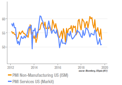 La baisse de l’indice des services, qui semblaient jusqu’ici immunisés du ralentissement manufacturier, a constitué une nette déception pour le marché. Si l’activité et les commandes se sont fortement repliées, elles ont simplement effacé les gains enregistrés le mois précédent. En revanche, la baisse de 2,7 pts de la composante emploi est plus inquiétante, car elle pourrait peser sur la confiance de ménages (les services sont de loin le premier employeur aux US), alors que la consommation est un élément qui a jusqu’ici constitué un amortisseur efficace contre les fluctuations de la demande extérieure. Notons enfin que la baisse de l’ISM confirme celle du PMI Markit, qui l’a précédée.