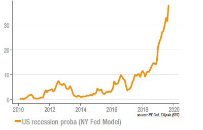 De nombreux modèles sont calibrés historiquement pour estimer la probabilité de récession à un an. Celui présenté sur le graphe est calculé par la Fed de NY et est basé sur les évolutions de la pente de la courbe des taux du Trésor américain. Notons que la hausse observée se retrouve dans la plupart des modèles, à l’exception de ceux utilisant des données de valorisation des actifs risqués (notamment les spreads de crédit). S’agissant du modèle ci-dessus, il faut garder à l’esprit que le comportement de l’inflation, et donc des taux courts, a fortement varié par rapport à l’échantillon d’estimation et que le contenu en anticipations des taux longs a été sensiblement réduit depuis que les banques centrales interviennent sur l’ensemble de la courbe.