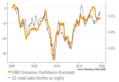 En séquentiel, les ventes de détail en zone euro ont progressé de +0,3% en août, après une contraction de 0,5% le mois précédent. En variation lissée sur une période plus longue (6m/6m sur le graphique), on obtient un niveau solide, supérieur à +2,5% annualisé (il s’agit de données en volumes). La consommation apparait donc comme un soutien pour l’activité au T3, particulièrement bien venu dans le contexte de demande extérieure et de climat des affaires déprimés. On notera que la croissance des ventes a concerné à la fois tous les secteurs (à l’exception de l’alimentaire) et l’ensemble des économies de la zone. La confiance des consommateurs est stable, à un degré assez élevé d’optimisme.