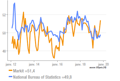Les deux indices de l’activité manufacturière ont enregistré une hausse en septembre, et ont surpris positivement les attentes. C’est une nouvelle d’autant plus favorable qu’elle intervient dans le contexte de guerre commerciale et alors que le soutien public à l’économie a été jusqu’à présent mesuré. Si l’on analyse l’indice NBS (un peu moins bruité que son concurrent), on observe une hausse de la production (52,3) et des nouvelles commandes (50,5). Les nouvelles commandes à l’export restent déprimées mais s’améliorent (passant de 47,2 à 48,2). L’indice composite progresse de 53,0 à 53,1. Autre signe notable de santé, les pressions sur les prix apparaissent plus fortes. Ces publications montrent à nouveau que la Chine résiste aux pressions américaines, ce qui promet un conflit long.