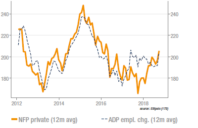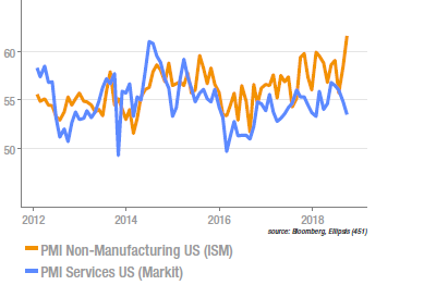 L’indice ISM non manufacturier a atteint cette semaine son point le plus haut depuis la crise, en s’établissant à 61,6. L’activité courante et l’emploi sont les contributions les plus notables (65,2 et 62,4, respectivement). Les tensions commerciales et la hausse des prix des inputs (l’indice correspondant est à 64,2) ne semblent pas entamer l’optimisme des sondés. Cette publication est une bonne nouvelle, même si les indicateurs avancés des services sont peu corrélés avec la croissance. A noter également le contraste entre l’enquête ISM et celle de Markit sur ce secteur, le PMI service s’étant inscrit en baisse depuis plusieurs mois, avec un écart important en septembre.