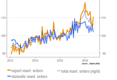 Les commandes à l’industrie allemande ont progressé de 2% m/m en août, contre 0,8% attendu. La nouvelle est positive, même si le tableau reste assez sombre: la moyenne juillet/août est 1,8% inférieure à celle du T2. L’introduction le premier septembre des nouvelles normes anti-pollution pour l’automobile a été un facteur très pénalisant mais qui devrait se révéler transitoire. A titre d’exemple, les immatriculations sont tombées en septembre à leur plus bas depuis la crise de l’euro. Il faut en outre noter que les commandes à l’export des véhicules se sont fortement reprises en août, particulièrement pour ce qui concerne l’extérieur de la zone euro. Au total, le secteur automobile allemand devrait reprendre des couleurs sur la fin de l’année.
