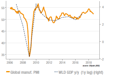 Contrastant avec les indicateurs américains, les PMI globaux publiés cette semaine font état d’un ralentissement de l’activité en septembre, qui prolonge une tendance à la baisse initiée depuis le plus haut atteint en décembre 2017. Le déclin est particulièrement visible sur les nouvelles commandes, notamment celles à l’export, dont l’indice est inférieur à 50 pour la première fois depuis 2016. Pour compliquer le tableau, la composante de prix des inputs est en hausse (indice à +60,7, que la hausse récente du pétrole ne devrait pas démentir) et des goulots d’étranglement apparaissent (faibles stocks, augmentation des délais de livraison des fournisseurs). La croissance mondiale ralentit donc probablement ce trimestre vers 3%, après 3,7% réalisé l’année passée.
