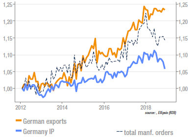 Il est surprenant d’observer en Allemagne la divergence entre les exportations de biens d’un coté et les commandes et la production de l’autre. De plus, si l’on met de coté l’automobile, la tendance des exportations est encore meilleure. La baisse enregistrée début 2018 est donc largement effacée et on peut s’attendre à une contribution significative au PIB au T4.