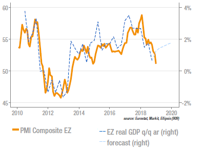 La baisse des PMI s’est poursuivie en zone euro, entrainant avec elle les anticipations de croissance. Au niveau actuel, le rythme instantané de l’activité apparait de l’ordre de 1%. La contribution négative des gilets jaunes est importante dans le PMI français, alors que leur effet réel devrait être progressivement maitrisé. D’autres facteurs devraient apporter du soutien à la croissance, notamment la reprise de la production d’automobiles en Allemagne, de la contribution des exports, des effets positifs de la baisse du chômage et de la hausse des salaires sur la consommation. Au total toutefois, la croissance pourrait avoisiner 1,75% au dernier trimestre, un niveau encore légèrement supérieur au potentiel (environ 1,2%).