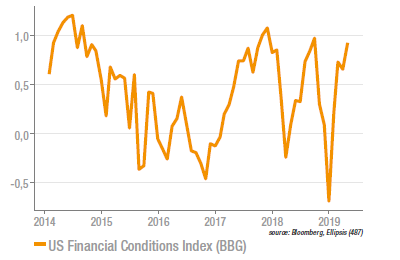 Les conditions financières, qui mesurent le soutien à l’économie que procure le niveau de certaines variables financières (taux de change, valeur des actions, spread de crédit, taux d’intérêt, …) sont revenues à des niveaux très favorables, après être brutalement passées par un gouffre à la fin 2018. On doit en déduire que les risques de récession de l’économie américaine ont considérablement baissé. Cette baisse des risques est à mettre en grande partie au crédit de l’assouplissement de la politique de la Fed, qui a mis en pause sa hausse des taux en début d’année. Il faut garder toutefois à l’esprit que celle-ci n’est possible qu’en raison du comportement très modéré de l’inflation.