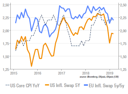 L’indice d’inflation aux US a progressé de 0,2% en janvier, hors alimentaire et énergie, ce qui porte à +2,2% le glissement annuel, ces deux chiffres se plaçant 10bp au-dessus des attentes. L’indice large est publié plus bas (+0,1% m/m et +1,5% y/y) en raison de la baisse marquée des prix de l’énergie (-4,8% pour la catégorie). Sur la composante core, les prix apparaissent fermes assez globalement, l’assurance automobile, le transport aérien et les ordinateurs faisant exception. Les biens progressent de 0,4% m/m, au plus haut depuis mai 2011. Les services réalisent quand à eux +0,2%, soit 2,8% y/y. On notera que certains services de TMT font l’objet d’une correction visant à refléter l’évolution technologique de l’offre dans ce secteur.