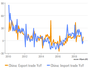Les exportations chinoises ont repris des couleurs en janvier, avec une croissance affichée de +9,1% y/y, très largement au-dessus du consensus. Il s’agit d’une bonne nouvelle même si l’approche des vacances de fin d’année (début février cette année) a dû conduire à accélérer certains échanges en janvier. A noter que les exportations progressent vers toutes les destination principales, à l’exception des US. Les importations ont également connu une amélioration, plus modeste toutefois. Celles-ci étant moins soumises aux distorsions de fin d’année, elles indiquent avec un niveau de certitude acceptable une reprise de la demande intérieure. Les chiffres d’activité ne seront disponibles qu’en mars, pour la période janvier/février.