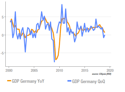 La croissance séquentielle en Allemagne au 4e trimestre est ressortie à 0,0%, mais, en raison des arrondis, à 0,1% en annualisé. Les commentaires qui l’ont accompagné (les détails ne seront disponibles que la semaine prochaine) sont plutôt encourageants. Il semble en effet que les variations de stocks soient le seul contributeur négatif, le rapport évoquant -une hausse sensible de l’investissement, particulièrement dans la construction mais également de l’investissement productif, -une faible hausse de la consommation, et –une contribution neutre du commerce extérieur. Le trimestre en cours devrait faire ressortir un rebond, les indicateurs avancés plaidant pour une croissance sous-jacente d’environ 1%.