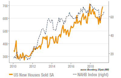 L’indice NAHB mesurant la confiance des entrepreneurs poursuit sa progression après une baisse prononcée en 2018. Il est probable que la baisse des taux (les taux hypothécaires ont perdu 80bp depuis novembre) ait joué un rôle important dans la reprise de la demande de logements. Cette publication, qui a dépassé les attentes, fait suite à d’autres nouvelles positives dans le secteur, comme la reprise des ventes dans le neuf (représentée sur le graphe), ou celle des mises en chantier. L’investissement résidentiel devrait donc contribuer positivement au PIB du T2. Si l’on analyse les indicateurs de surprises économiques, l’immobilier, avec l’emploi, sont les seuls contributeurs positifs.