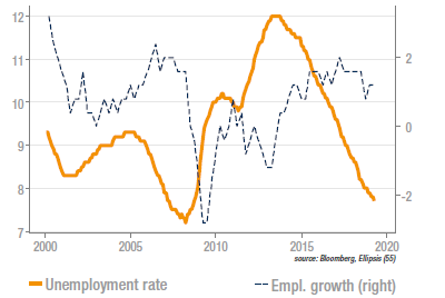 L’estimation de la croissance de l’emploi en zone euro pour le T1 a été publiée à +1,4% /a. C’est une nouvelle positive, car la baisse observée en 2018 était préoccupante. Elle signale à la fois un appétit des entreprises mais également une hausse du revenu des ménages, accroissant la demande. On notera d’ailleurs que la composante emploi du PMI était restée assez stable en 2018 (plus en tous cas que les hard data) et les bons niveaux récents de cet indicateur suggèrent que les créations d’emploi sont restées dynamiques au T2, ce qui permet d’espérer une croissance assez bonne sur l’ensemble de l’année. Le taux de chômage s’est logiquement inscrit en baisse, à 7,7%.