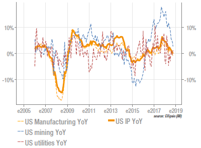 Confirmant les sombres prédictions des indicateurs avancés, la production industrielle a baissé de 0,4% m/m en septembre, dépassant même les attentes (-0,2%). Il faut toutefois tempérer ces chiffres par le fait que la grève en cours chez General Motors y a beaucoup joué, et devrait le faire encore en octobre. Dans un contexte de guerre commerciale, de baisse de la consommation de biens manufacturés et compte tenu de la force du dollar, il est difficile d’envisager rapidement un rebond significatif. Comme indiqué plus haut, la production de véhicules a connu un fort ralentissement (-4,2%), tandis que les autres biens manufacturés baissaient de 0,2%. Ailleurs, la production minière a baissé de 1,3%, les utilities ont progressé de 1,4%.