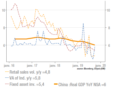Le dernier rapport sur l’activité chinoise montre une croissance de 6%/a au T3, en baisse de 0,2% par rapport au T2. A la fin du trimestre, toutefois, les indicateurs sont positifs, avec une croissance de 0,7% m/m en septembre de la production industrielle et des investissements qui progressent de +4,7% en glissement annuel. Si l’on décompose par la demande le PIB des trois premiers trimestres, on observe: une contribution de 3,8% de la consommation, 1,2% de l’investissement et 1,2% des exportations. On voit donc que la pression de la guerre commerciale n’a pas causé d’effondrement de la demande extérieure. En outre, le mini-deal en cours de signature avec les US devrait assurer un soutien du sentiment et éviter une dégradation des conditions de l’activité.