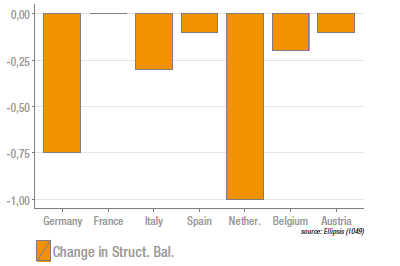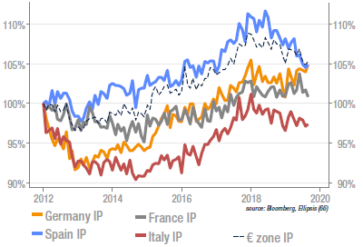Selon les règles du semestre européen, chaque état membre doit soumettre une proposition de budget au mois de septembre. Il ressort, pour 2020, un soutien budgétaire attendu de l’ordre de 0,2% (baisse de la balance budgétaire primaire de +0,9% à +0,7% du PIB). On notera qu’avec l’augmentation de la croissance, attendue à +1,4% l’année prochaine, contre +1,2% cette année, et la baisse des charges d’intérêt, ce soutien budgétaire s’effectuera à déficit constant (il est attendu inchangé à -0,8% en 2020). En termes structurels, l’impulsion budgétaire devrait être de l’ordre de 0,4%. Une grande partie de l’assouplissement provient de l’Allemagne et des Pays-Bas. La France et l’Espagne seraient neutres en 2020. En Italie, le déficit serait maintenu à -2,2%, fournissant un assouplissement de 0,3%.