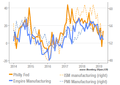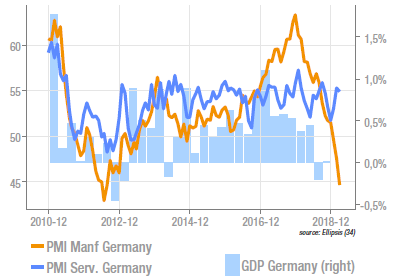 Publié à 44,7 contre 48,0 attendu, cet indicateur est au plus bas depuis la crise de l’euro en 2012. Même en tenant compte des incertitudes importantes qui assombrissent le climat des affaires en Allemagne, la comparaison entre ces deux périodes semble très exagérée et contredit d’autres indicateurs (voir ci-dessus). De même, l’écart entre les secteurs manufacturier et des services est à un tel niveau (44,7 pour l’un, 54,9 pour l’autre), qu’on peut facilement supposer que l’une des deux enquêtes est erronée. Autres motif de surprise, le PMI composite français baisse fortement alors que les perturbations liées aux gilets jaunes sont en retrait. Enfin, le composite global européen est tiré par le reste de la zone, alors que les incertitudes autour de l’Italie et de l’Irlande devraient être logiquement élevées.