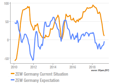 L’enquête ZEW publiée en mars a fait ressortir une amélioration assez significative du moral des acteurs des marchés financiers en Allemagne, tandis que l’appréciation de la situation courante baissait fortement. On voit donc que l’appréciation pessimiste des risques pesant sur l’économie allemande – qui avait atteint un plus bas en fin d’année – est en cours de résorption, même si l’indicateur reste en dessous de la barre du 0 (autant d’optimistes que de pessimistes) et loin en dessous de la moyenne de long-terme (22 pts). Evidemment, ce mouvement reflète la perspective d’un accord sino-américain, le délai probable du Brexit et la normalisation en cours dans le secteur automobile.