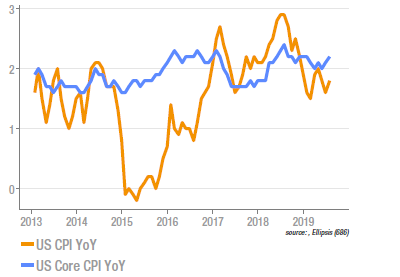 L’indice d’inflation core (hors alimentaire et énergie) a progressé aux US plus rapidement que prévu en juillet, à +2,2% en glissement annuel. Cette publication, qui semble en ligne avec les objectifs de la Fed, rend assez surprenant le tournant dovish de la politique monétaire. Cette contradiction illustre le fait que des considérations extra-monétaires – en premier lieu la guerre commerciale – jouent beaucoup dans les décisions récentes de la Fed, et ce d’autant que les indicateurs du marché de l’emploi sont également au beau fixe (les salaires ont progressé de 1,3% y/y en termes réels). L’inflation globale a progressé elle moins vite en raison d’une stagnation des prix alimentaires.
