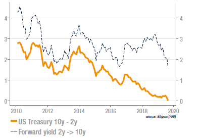 Le seuil symbolique de 0 a été franchi pour la différence entre les taux à 2 et 10 ans aux US. Historiquement, ce phénomène de marché a précédé la plupart des récessions. Si l’on calcule les probabilités induites (dans un modèle probit assez rudimentaire), elles ressortent à 26% de chance qu’une récession se produise dans les 6 prochains trimestres (cette probabilité est de 17% en l’absence d’informations particulières). On peut attribuer cette configuration au fait que la Fed semble de plus en plus réceptive aux signaux du marché obligataires. Ainsi, la baisse de la pente est interprétée comme un signal récessif, incitant une réaction dovish et…une nouvelle baisse de la pente.